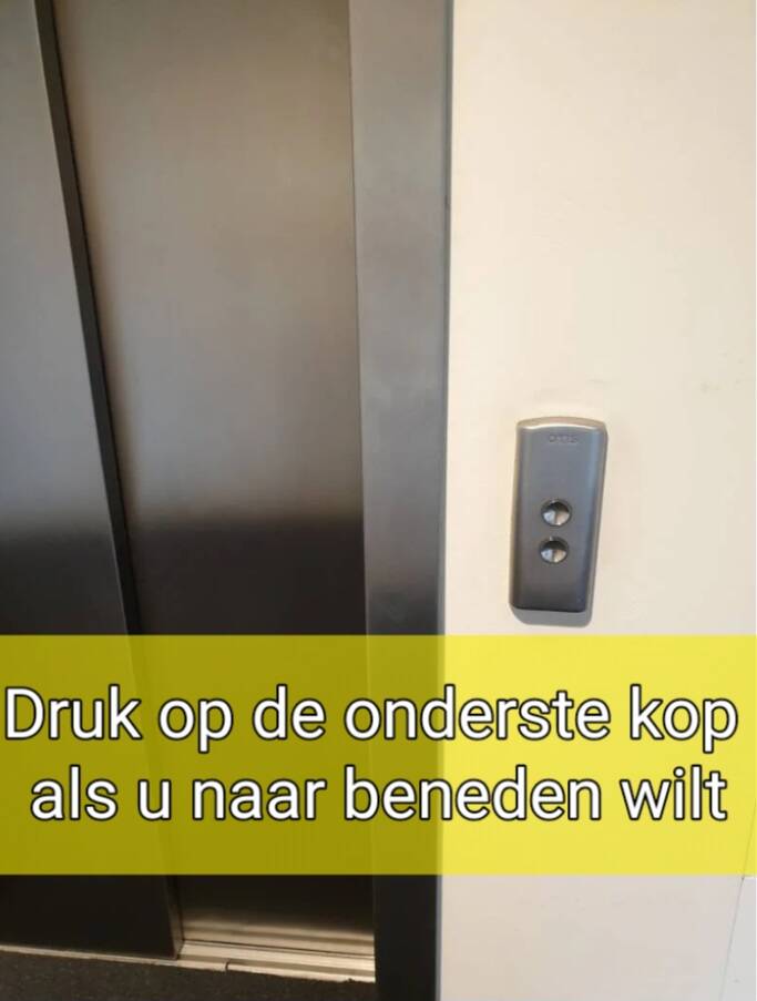 - druk op de bovenste knop als u naar een hogere etage wilt; een lift die al onderweg is naar beneden, stopt dan niet