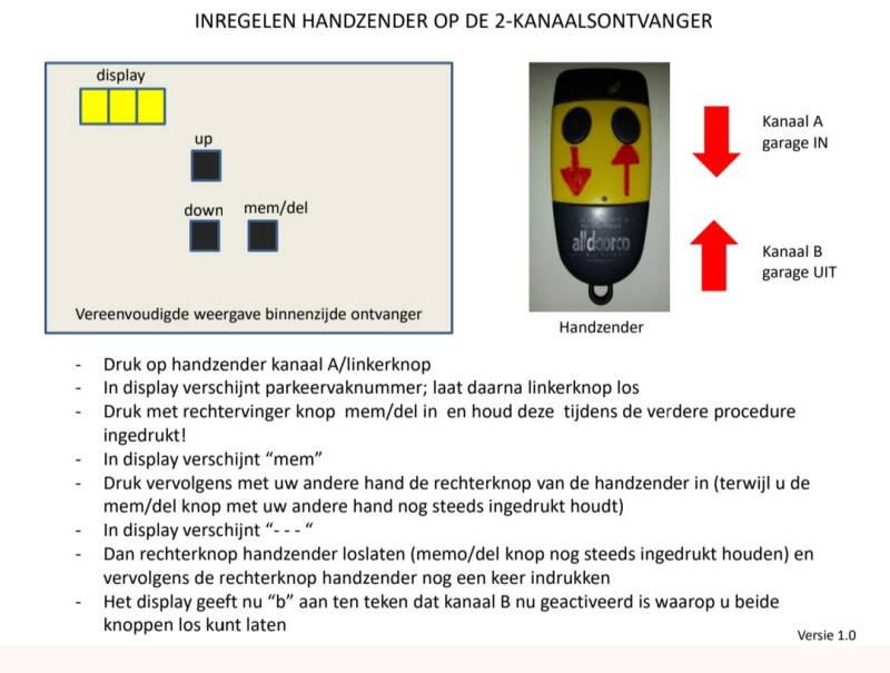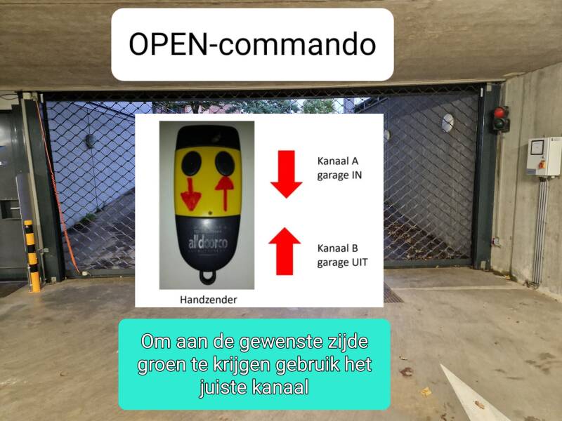 Uw handzender is geprogrammeerd voor tweekanaalsgebruik. Dit betekent dat van de twee kanalen (knoppen op uw handzender) een kanaal bestemd is om de roldeur te openen voor binnenrijden parkeergarage en het andere kanaal voor uitrijden.
