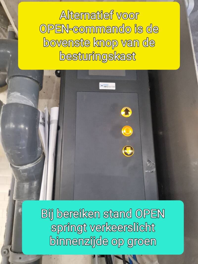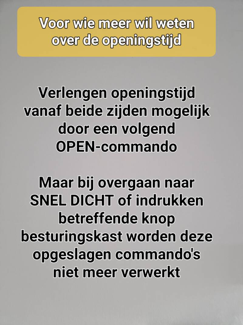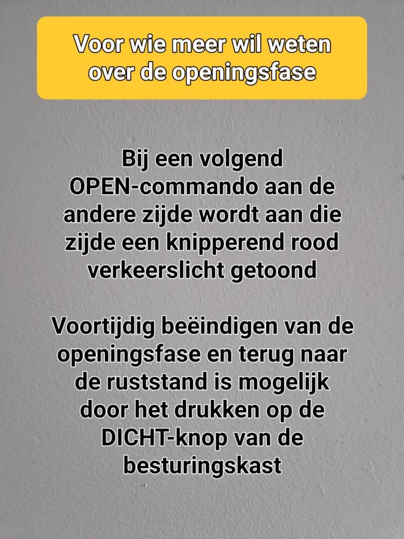 De geopende stand wordt bereikt ca. 12 seconden na indrukken van een van de twee knoppen op uw handzender. Gedurende deze tijd van opengaan (de openingsfase van de roldeur) staat het verkeerslicht aan beide zijden op rood. In de open stand blijft de roldeur - indien er geen auto de roldeur passeert en geen opvolgend OPEN- commando gegeven is voor 15 seconden met aan een zijde het groene licht en de andere zijde het rode licht. Daarna volgt aan beide zijde een rood knipperlicht waarna de automatische sluiting begint. Gedurende de sluiting staan de verkeerslichten aan beide zijden continu op rood. Het sluiten van de roldeur (inclusief de inleidende ca. 3 seconden durende knipperlichtfase) duurt ook weer zo'n 15 seconden.