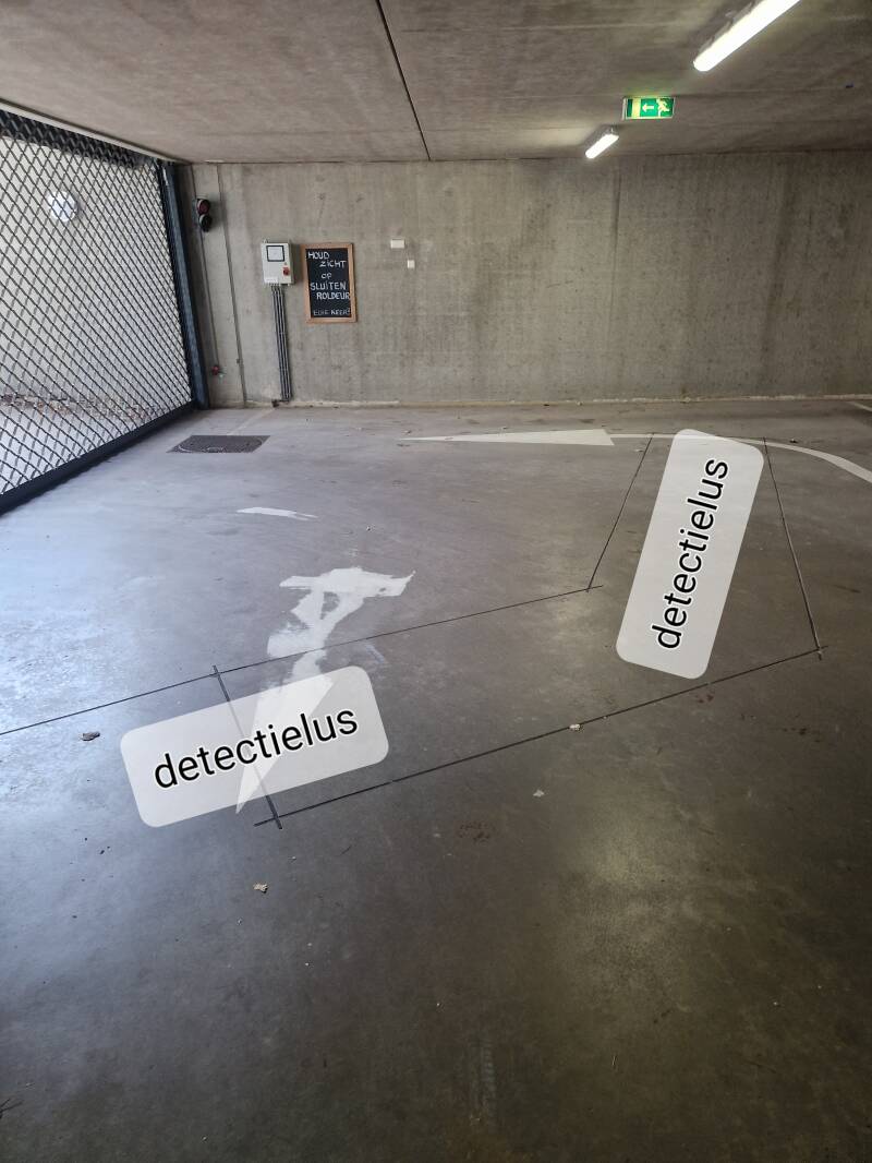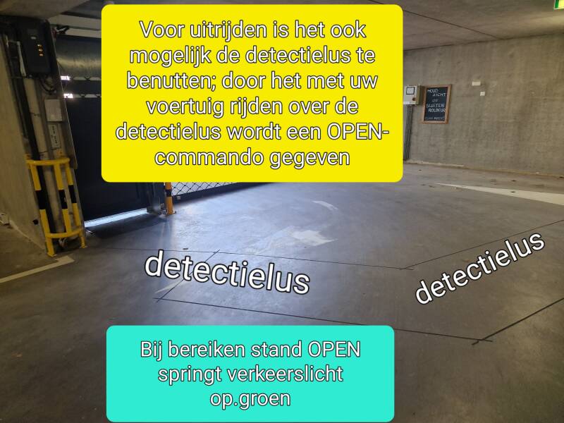 Voor het verlaten van de parkeergarage hoeft u uw handzender niet per se te gebruiken. In de vloer voor roldeur is een detectielus aangebracht; zie foto hierboven. Zodra u met uw voertuig over de detectielus rijdt, wordt door het metaal in uw voertuig het magnetisch veld (inductieveld) van deze lus beïnvloed hetgeen een signaal afgeeft aan de besturingskast de roldeur te openen. Wilt u hiervan gebruikmaken rijdt dan op tot voor de roldeur, heb ca. 1 seconde geduld en de roldeur begint omhoog te gaan. Chauffeurs van de parkeervakken 1 - 3 en 26, 27 rijden bij het manoeuvreren uit hun vak gauw een paar keer over de grondlus dus zullen hun handzender waarschijnlijk alleen gebruiken als ze erg veel haast hebben. :)
