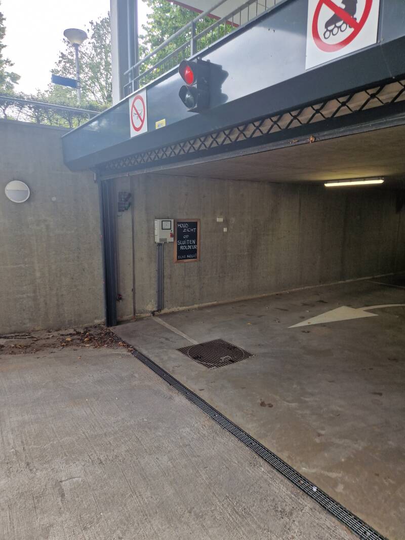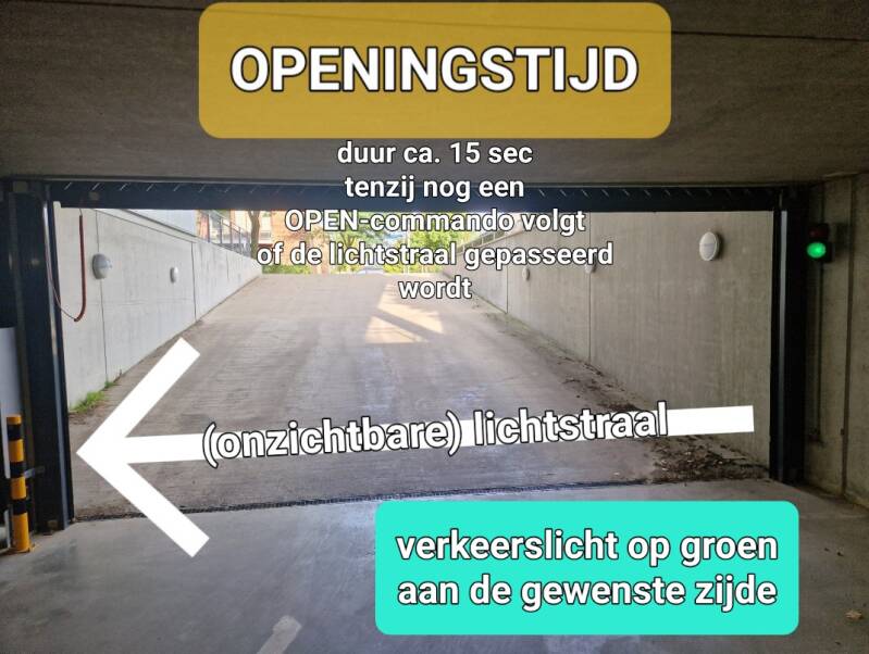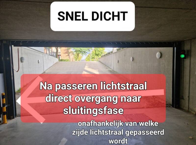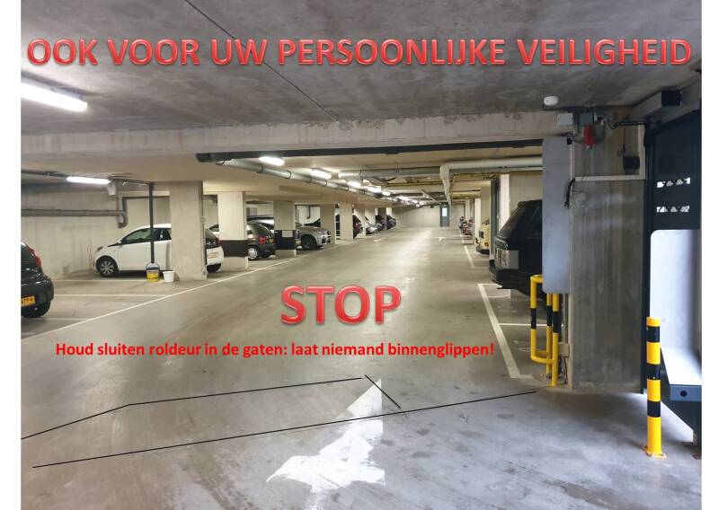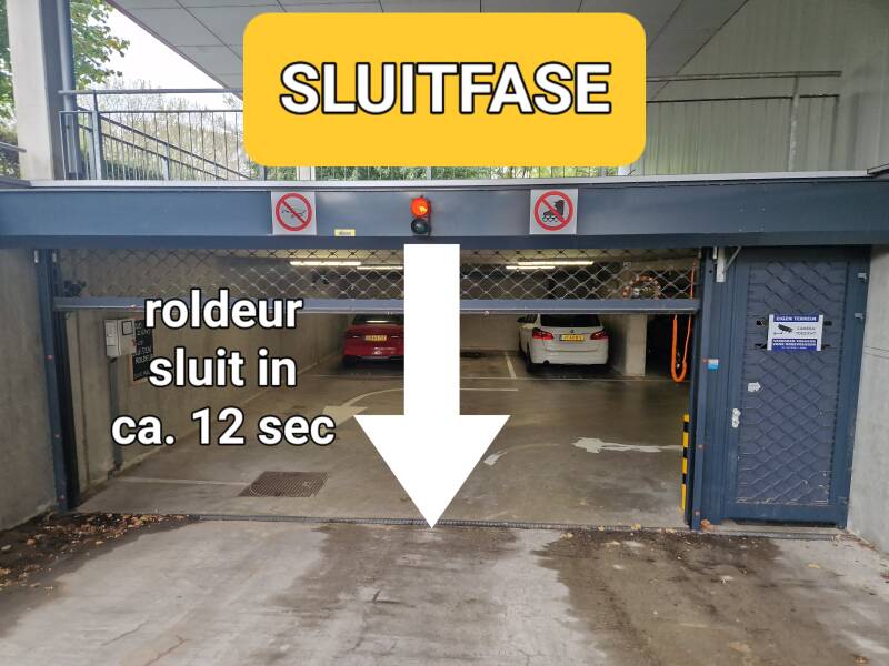 Bij binnenrijden in de parkeergarage is het veiligste (ook voor uw persoonlijke veiligheid!) direct nadat u de grondlus over bent gereden even te stoppen en pas nadat de roldeur zover dicht is dat niemand meer binnen kan glippen verder naar uw parkeervak te rijden.