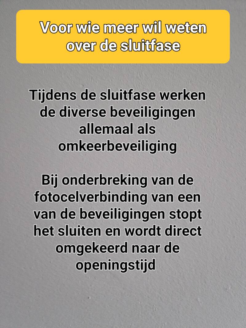 Ongeveer een halve meter boven de vloer waar u de roldeur onderdoor gaat, wordt door twee fotocellen een optische (infrarood; voor de mens onzichtbaar) verbinding onderhouden. Wanneer deze lichtstraal onderbroken wordt, stopt de roldeur direct met sluiten en gaat weer omhoog. Deze fotocelverbinding fungeert als een omkeerbeveiliging. Daarnaast heeft hij nog een essentiële functie in dienst van de besturing van het automatisch sluitingssysteem bij programering (zoals bij ons het geval is) van parameter SNEL DICHT. Bij passeren van deze lichtstraal gaat de roldeur over naar de sluitfase en wordt de resterende openingstijd van de roldeur niet meer voltooid.