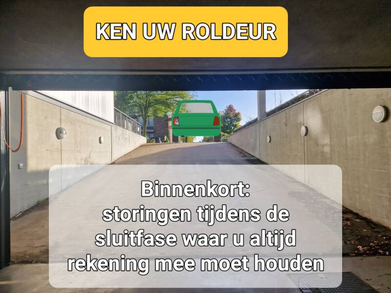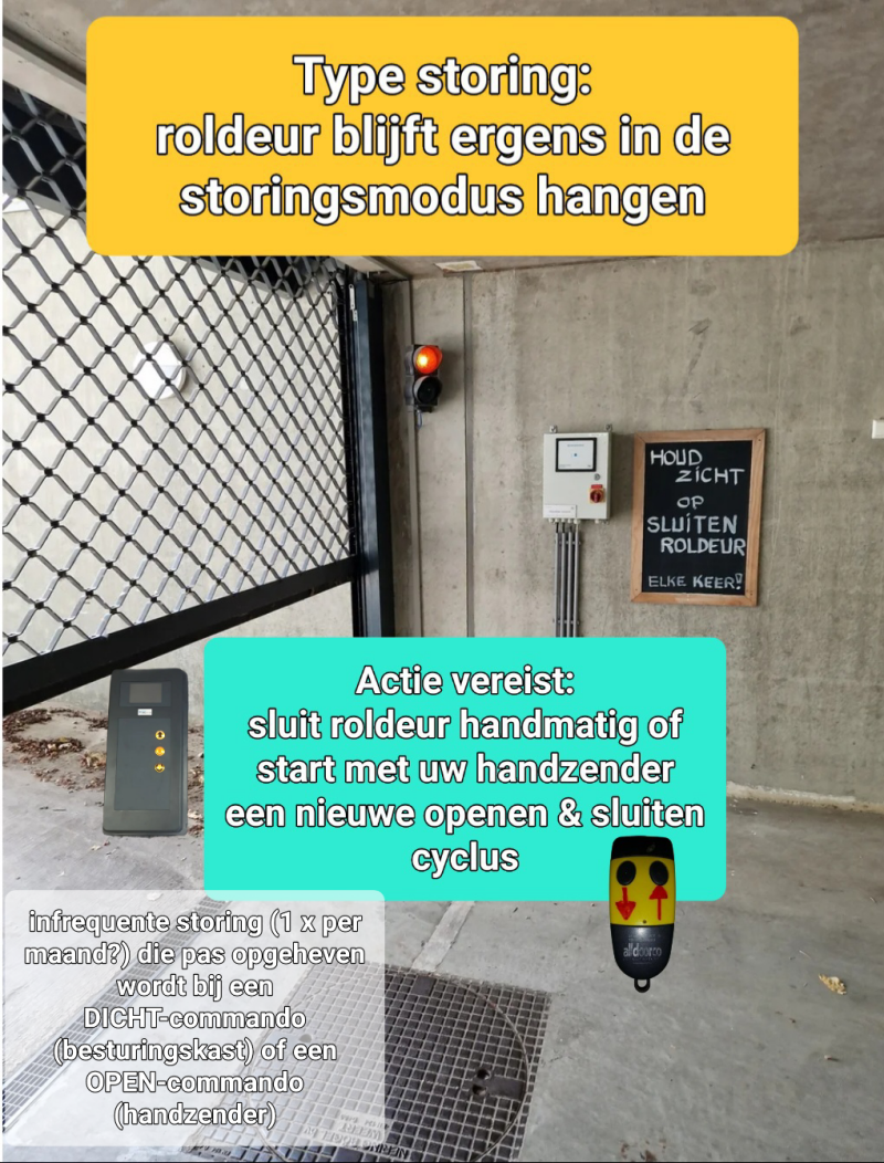 Maar ook zonder dat onderdelen defect zijn of hun einde levensduur naderen kunnen er zo nu en dan technische storingen optreden. Vertrouw daarom nooit 100% op de techniek van het automatisch sluitingssysteem. Een type storing die bijvoorbeeld maanden niet kan voorkomen en dan plotseling meerdere keren in een week tijd, is een hangende deur in de hoogste stand of ergens in de sluitingsfase blijven hangen met aan beide zijden een knipperend rood licht terwijl in de parkeergarage een tikkend geluid van een relais hoorbaar is. Treft u de roldeur zo aan, sluit deze dan omwille van de inbraakveiligheid onmiddellijk handmatig (tip: zit u in de auto kunt u ook uw handzender nog een keer indrukken voor starten nieuwe open-en-dichtcyclus). en laat het niet aankomen of met de volgende uitrijdende of binnenrijdende chauffeur deze storing wordt opgeheven. De oorzaken van dit type infrequente en eenmalige storingen zijn onduidelijk. Een vermoeden als ( een ) mogelijk oorzaak is dat door in het rond waaiende bladeren of spinnenrag aan de mazen van de roldeur een van de intrekbeveiligingen tijdens het sluiten bij herhaling wordt onderbroken.