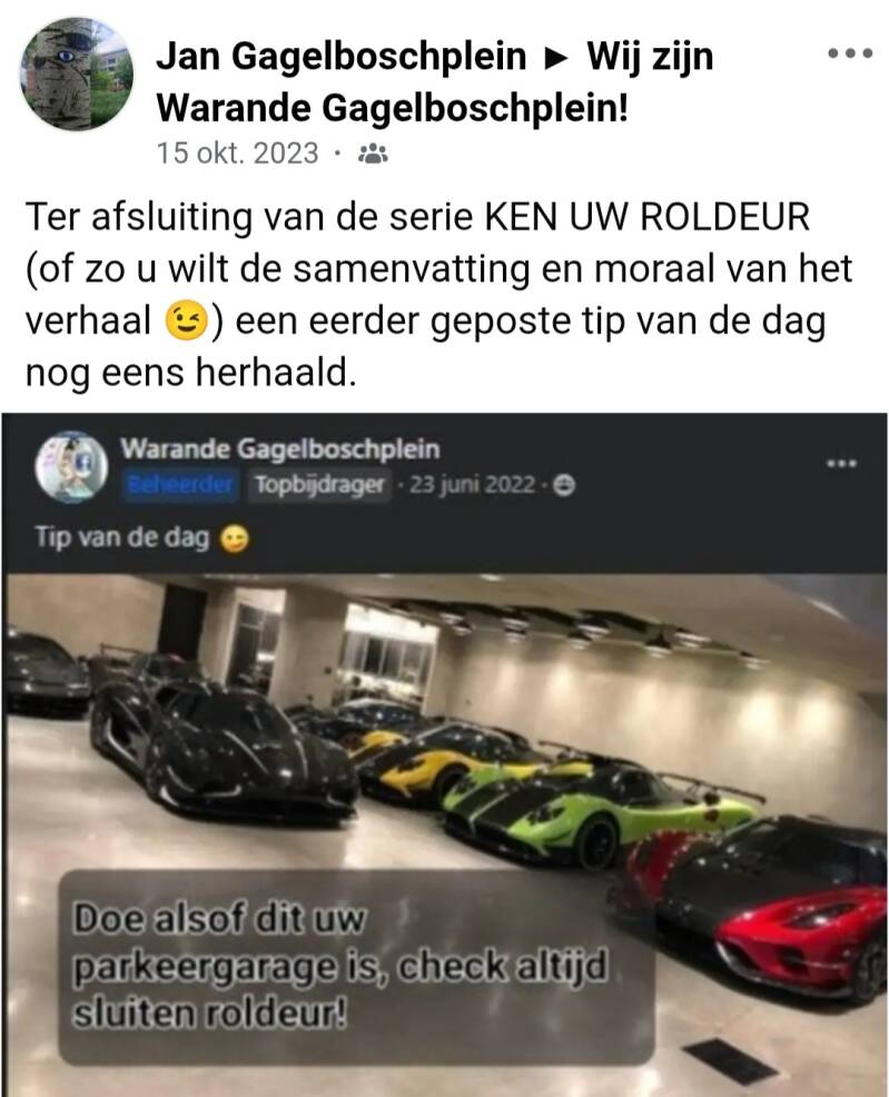 Van de uitgegeven handzenders is door beheerder van de besloten Faceboekgroep Klankboek Warande bijgehouden (en gepost op Klankboek; noot: sinds medio 2024 heet de besloten groep 'Wij zijn Warande Gagelboschplein' ) op welk nummer deze in de ontvanger zijn ingeregeld. Doel van deze registratie is om in voorkomend geval na verlies van uw handzender deze zo spoedig mogelijk te kunnen laten blokkeren. Tot blokkeren van een handzender zal alleen worden overgegaan indien er een reëel veiligheidsrisico is voor inbraak hiermee in de parkeergarage. Denk aan verlies van de handzender op het Gagelboschplein of zo dichtbij dat deze eenvoudig is te herleiden tot onze parkeergarage.