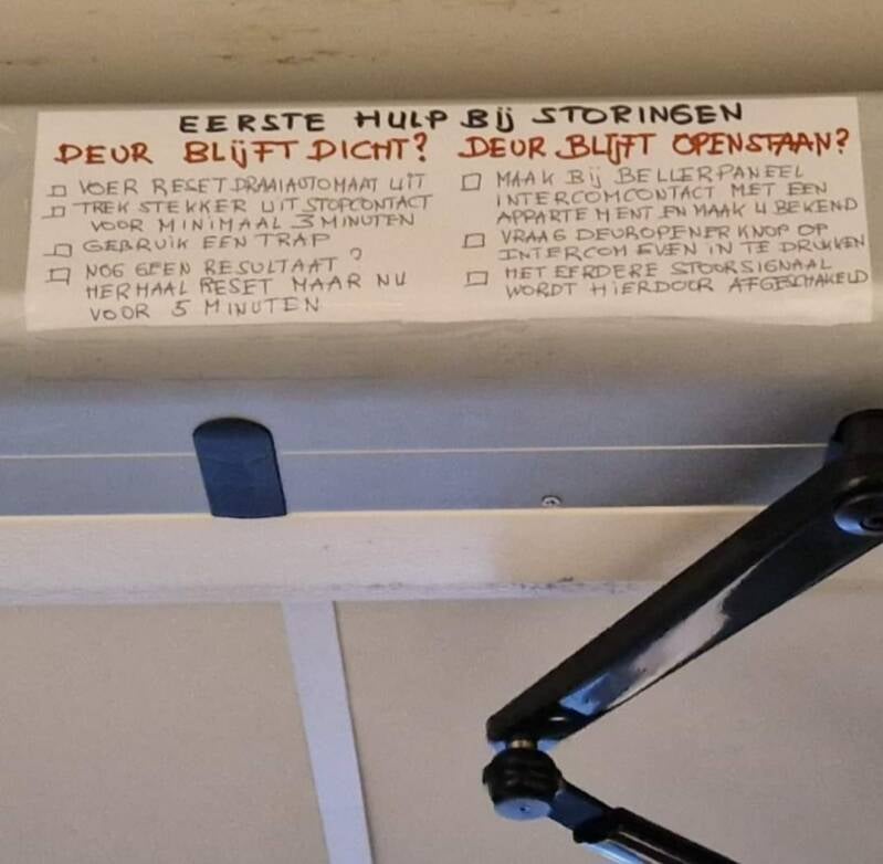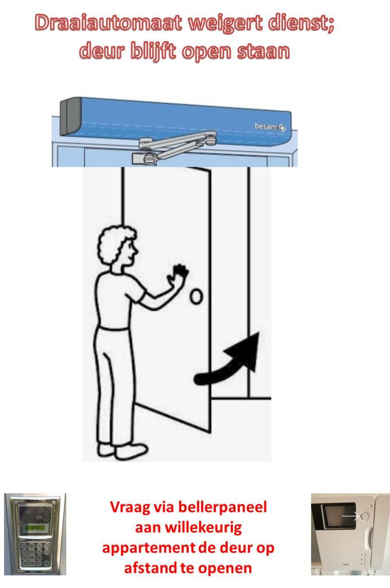 Is de herstart succesvol maar blijkt de deur daarna in open stand te blijven staan (zie ook storingstype hierna behandeld in meer detail) dan staat er zeer waarschijnlijk een permanent intercomsignaal (puls voor openen deur) op de draaiautomaat. Proefondervindelijk is vast komen te staan, dat dit permanente stroomsignaal afgeschakeld kan worden door via het bellerpaneel behorende bij deze entree contact op te nemen met een wilekeurige appartement en de deuropenerknop op de videofoon te laten bedienen voor openen deur. Hierdoor wordt het permanente stoorsignal overruled en afgeschakeld. Meestal zal deze vervolgstoringsmaatregel niet meer nodig zijn; zodra in de vergrendelde storingsmodus in reactie op een aanbeller de deuropenerknop wordt gebruikt, is dit permanent signaal al afgeschakeld.
