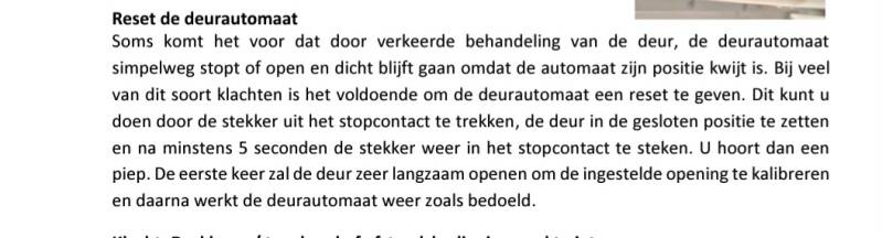 Ga over tot een reset van de draaiautomaat. In principe is na een reset de storingsmodus opgeheven tenzij onderdelen als de motor van de draaiautomaat, de elektrische sluitplaat defect zijn/einde levensduur bereikt hebben of intern in de behuizing van de draaiautomaat bedrading is losgeraakt e.d. Om de draaiautomaat te laten resetten, neem de stekker uit het stopcontact en plaats deze na minimaal 2 minuten pas weer terug. Indien de deur nu openslaat (bij terugplaatsen stekker bevindt u zich namelijk in de detectiezone van de radar) is de deur uit de storingsmodus gekomen. Blijkt de deur echter nog steeds vergrendeld (let op of er eventueel toch geen ander probleem speelt namelijk de draaiautomaat slaat wel aan maar de dagschoot komt net niet los uit de elektrische sluitplaat, zo ja consulteer een meer ervaren storingzoeker onder de bewoners voor bijstelling schootvanger), probeer dan een langere tijd voor de reset uit bijvoorbeeld 5 minuut. De praktijk van het storingzoeken heeft aangetoond dat soms meer dan 2 minuten nodig zijn voor de draaiautomaat om zich te resetten en de herstart van de draaiautomaat dan pas lukt.